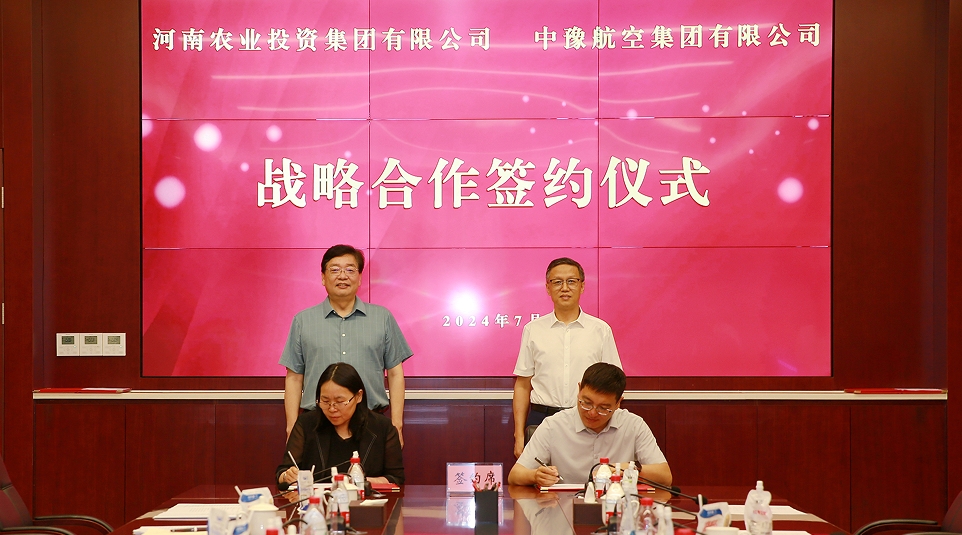 7月18日下午,中豫航空集團與河南農(nóng)投集團在農(nóng)投國際中心舉行工作會商,簽訂戰(zhàn)略合作協(xié)議。中豫航空集團黨委書記、董事長張明超;河南農(nóng)投集團黨委書記、董事長李曉寰,總經(jīng)理、副董事長張淑杰參加會談并見證雙方簽約。中豫航空集團副總經(jīng)理劉霞,河南農(nóng)投集團副總經(jīng)理張峰代表雙方簽署戰(zhàn)略合作協(xié)議。雙方相關業(yè)務負責人參加。