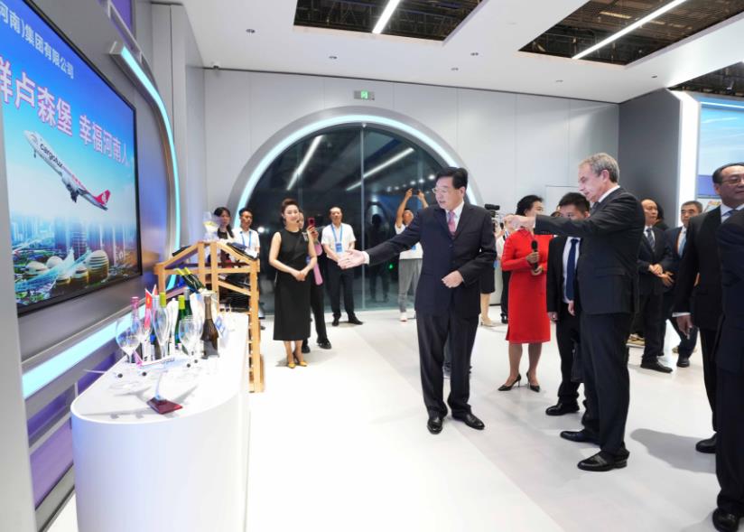 論壇開始前,與會嘉賓參觀了主題展臺。在中豫航空集團展臺前,嘉賓們被來自盧森堡的“申根精神”葡萄酒、法國知名品牌水晶杯、德國繪有“絲綢之路”元素的骨瓷等產品吸引;詳細了解了鄭盧“空中絲路”在中歐互聯互通、經貿往來中發揮的橋梁作用。