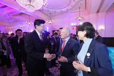 貝泰爾在招待會的致辭中簡要回顧了商貿團在北京和上海的交流情況,對參加招待會的各方代表表示感謝。致辭后,講臺上的貝泰爾看到張明超一行很是驚喜,立即向老朋友們舉手示意,并在隨后的自由交流環節與盧睿朗一起同張明超交談。